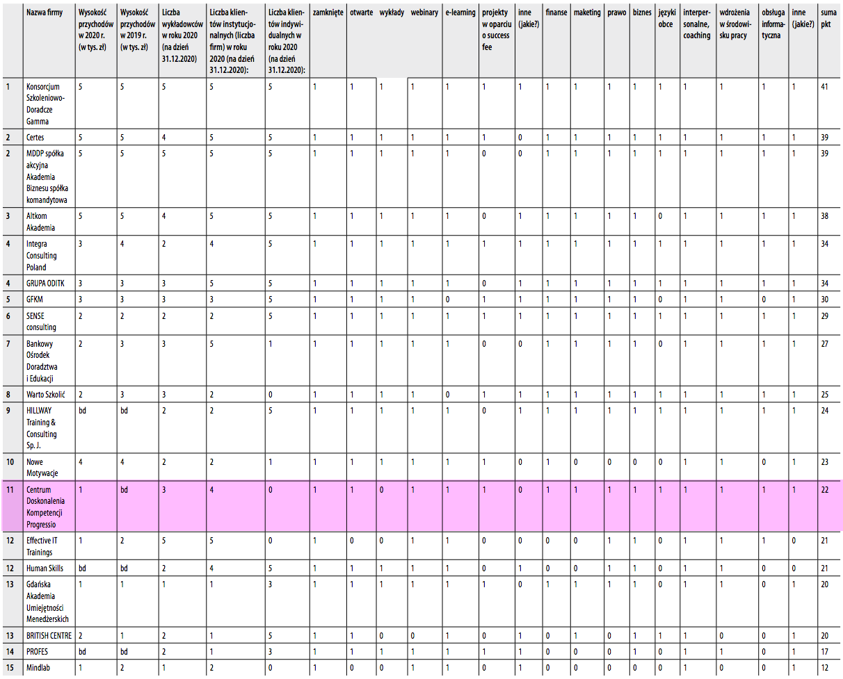 Przed takimi dylematami stają na co dzień przedstawiciele firm, którzy dotychczas uwzględniali potrzebę szkolenia pracowników w ramach swojej działalności. Jakie trendy panują na rynku szkoleń? Czy branża radzi sobie, mimo konieczności przeniesienia się do przestrzeni online? Jak rzeczywistość covidowa wpłynie na przyszłość sektora? Gazeta Finansowa zaprosiła firmy funkcjonujące na rynku szkoleń do wypełnienia ankiety, którą rozsyła do branży każdego roku. Na podstawie odesłanych zgłoszeń stworzyła ranking, który pokazuje, jak radzą sobie ci, którzy zechcieli podzielić się z nami swoimi wynikami, a wśród nich nasze CDK Progressio. Analizujcie Państwo i czytajcie. My tak samo jak redakcja Gazety Finsnowej, która na rynku jest już prawie 30 lat, stoimy na stanowisku, że na rozwój każdy czas jest dobry. A szkolenia to rozwój.